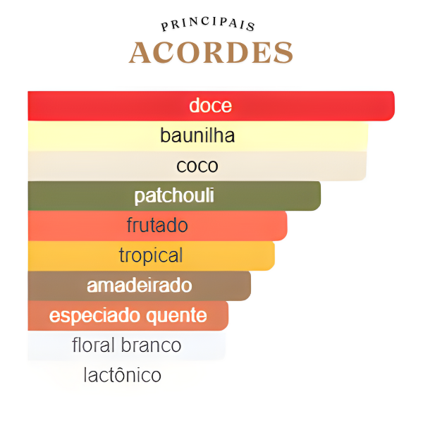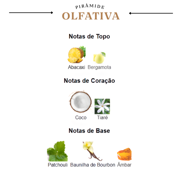 A jornada começa com uma abertura efervescente e exótica de Abacaxi suculento e Bergamota cítrica, criando uma sensação imediata de férias paradisíacas e calor envolvente. O coração floresce em um acorde cremoso e gourmand de Coco e a flor branca de Tiaré, transportando a essência para uma piña colada refinada e sofisticada.