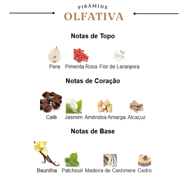 A jornada olfativa começa com um toque de adrenalina, uma fusão frutada e picante de pera e pimenta rosa, que rapidamente dá lugar ao coração da fragrância. Aqui, a nota inconfundível de café se une a um buquê de jasmim e à amêndoa amarga, criando um contraste fascinante e audacioso. A experiência culmina em uma base quente e sensual de baunilha e patchouli, envolta na suavidade da madeira de cashmere, garantindo um rastro profundo, duradouro e absolutamente inesquecível.