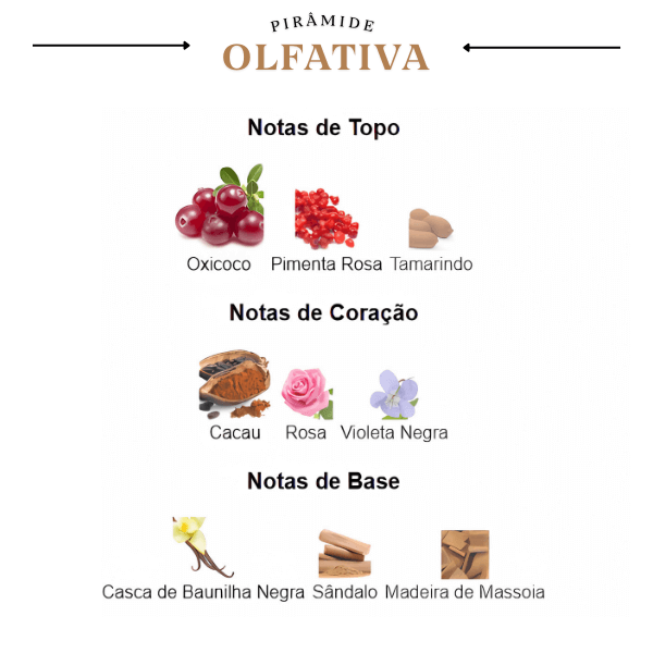 A jornada olfativa começa com uma abertura frutada e picante, onde a acidez do oxicoco se une à pimenta rosa e ao tamarindo, criando uma primeira impressão vibrante e inesperada. No coração, a fragrância se aprofunda com notas escuras e sensuais de cacau, misturadas à delicadeza da rosa e da violeta negra, adicionando uma profundidade intrigante. A experiência culmina em uma base quente e amadeirada, onde a casca de baunilha negra e o sândalo se combinam para criar um rastro poderoso e inesquecível, que é ao mesmo tempo doce e extremamente sedutor.