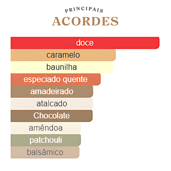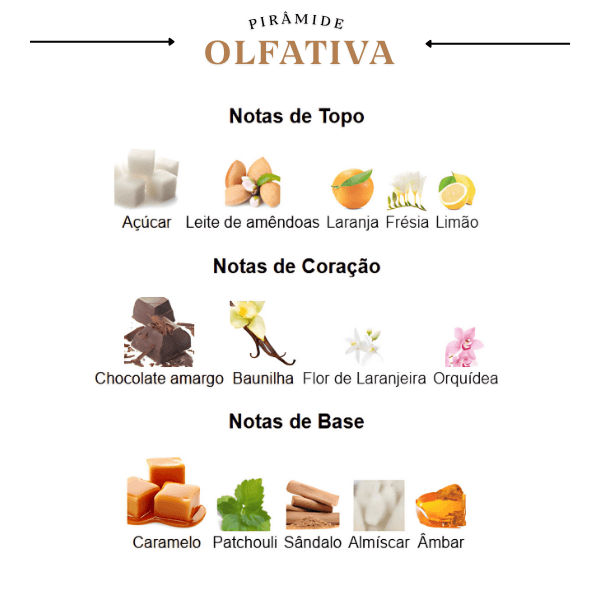 A jornada começa com uma abertura cremosa e açucarada, onde as notas de leite de amêndoas e açúcar se misturam com um toque cítrico de laranja. O coração é a alma da fragrância, uma combinação rica e deliciosa de chocolate amargo e baunilha, com a delicadeza floral da flor de laranjeira. A experiência atinge o seu ápice em uma base envolvente e sensual, onde o caramelo se destaca, complementado por notas amadeiradas de sândalo e a profundidade do patchouli, garantindo um rastro duradouro e verdadeiramente de dar água na boca.