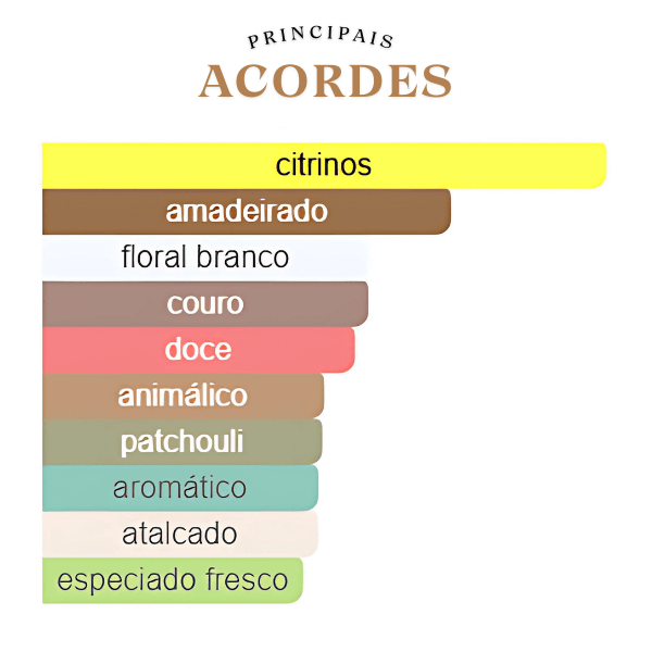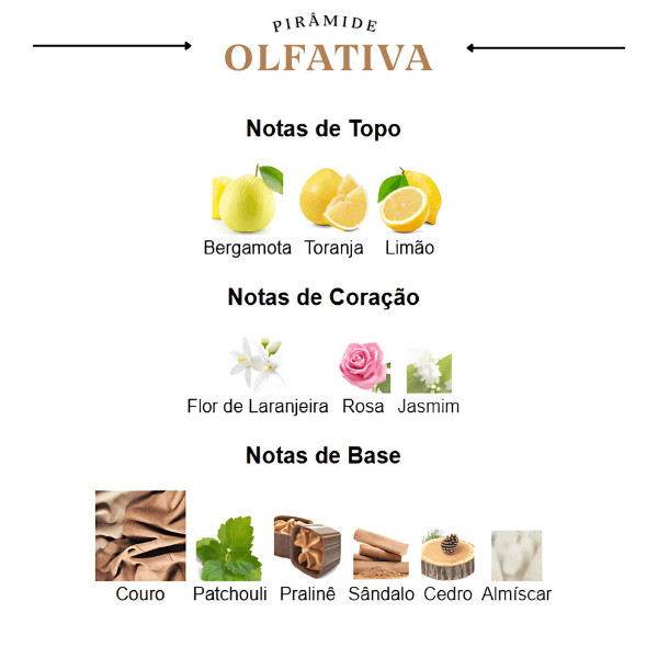A jornada olfativa se inicia com uma explosão cítrica e refrescante de bergamota, toranja e limão, criando uma primeira impressão vibrante e luminosa. No coração, a fragrância floresce em um buquê floral branco elegante e cativante de flor de laranjeira, rosa e jasmim, que adicionam uma feminilidade suave e sofisticada. A base é profunda e inesquecível, com uma fusão de couro e patchouli, que se unem ao pralinê, sândalo, cedro e almíscar para garantir um rastro doce, terroso e amadeirado, deixando uma assinatura olfativa incrivelmente magnética e fascinante.