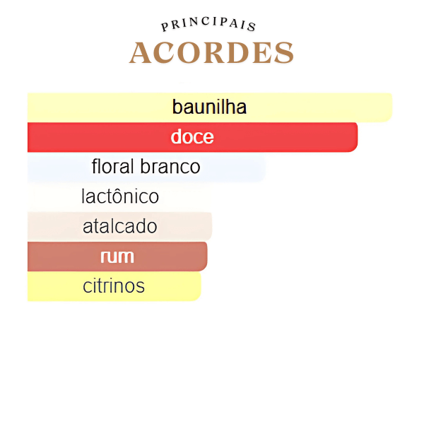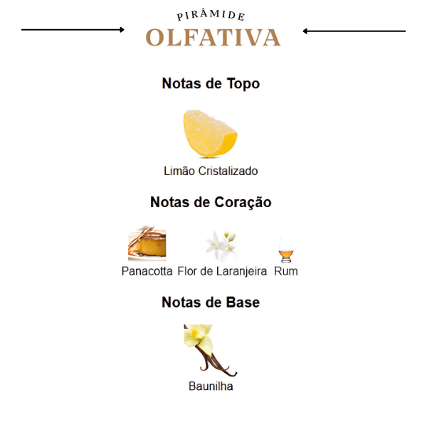 A experiência olfativa se inicia com uma nota de topo brilhante e convidativa de limão cristalizado, que evoca o calor e a alegria de um dia ensolarado. A jornada continua em um coração cremoso e envolvente, onde a flor de laranjeira se une à panacotta e a um toque de rum, criando uma sensação deliciosa e quase palpável. A base da fragrância, quente e sensual, é construída sobre uma única nota, a baunilha, que finaliza a composição com uma assinatura rica e duradoura que simplesmente não pode ser ignorada.