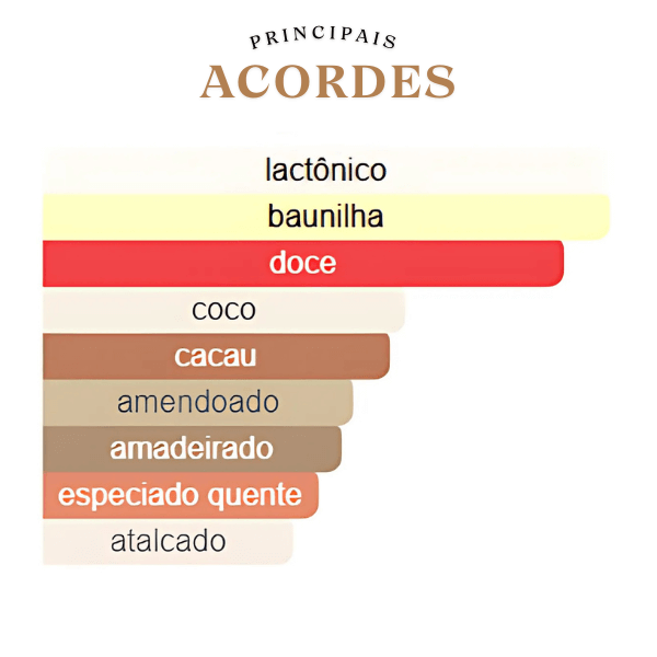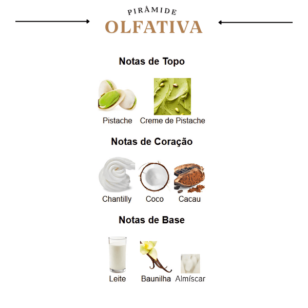 A fragrância se inicia com um acorde inusitado e delicioso de Pistache e Creme de Pistache, criando uma primeira impressão cremosa e marcante. No coração, o perfume revela um toque adocicado e aveludado de Chantilly, com a riqueza do Coco e a profundidade do Cacau, que se misturam para criar um coração rico e envolvente. A base é uma fusão poderosa e persistente de Leite, Baunilha e Almíscar, que conferem uma profundidade quente, lactônica e uma longevidade impressionante.
