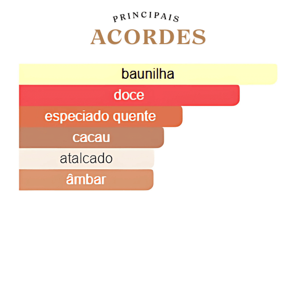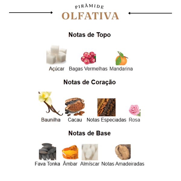 A jornada olfativa se inicia com uma abertura açucarada e frutada, onde as bagas vermelhas e a mandarina se misturam, criando um convite inicial delicioso. Em seu coração, a fragrância se aprofunda com notas de baunilha e cacau, que trazem uma riqueza cremosa e envolvente, com o toque sutil e especiado da rosa que adiciona complexidade. A base, profunda e acolhedora, é um blend de fava tonka e almíscar, com um rastro amadeirado e ambarado que garante uma fixação poderosa e uma impressão memorável, ideal para os momentos mais especiais.