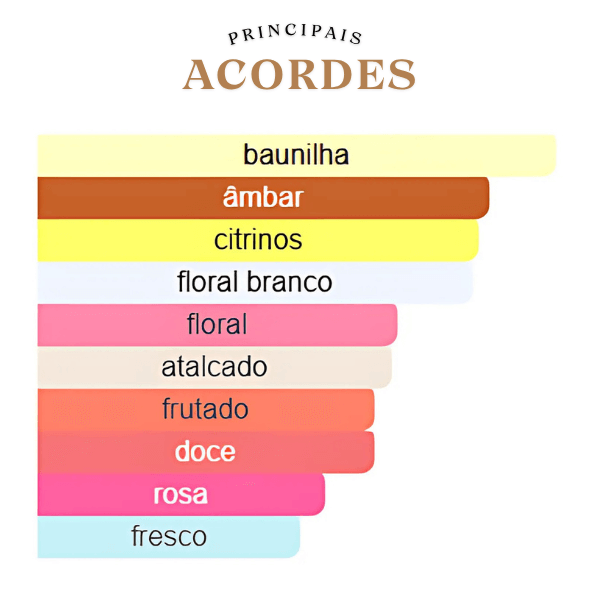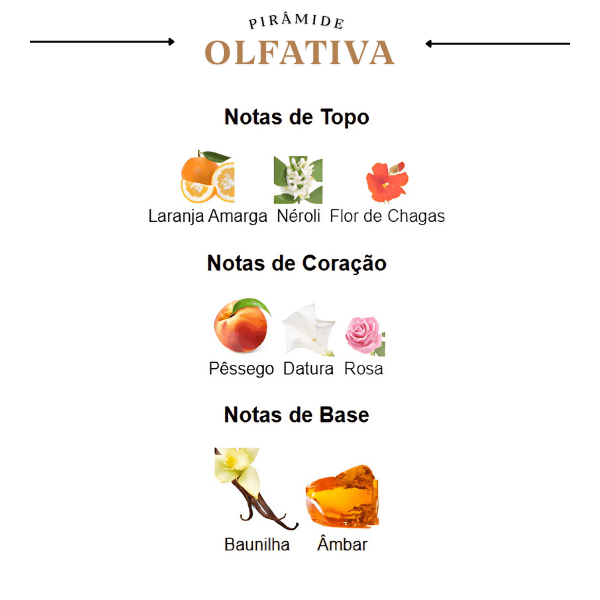 A jornada olfativa se inicia com uma explosão cítrica e intrigante de laranja amarga, néroli e flor de chagas, que trazem um frescor luminoso e inesperado. No coração, a fragrância floresce em um buquê floral frutado de pêssego e rosa, que se unem à datura para adicionar uma feminilidade profunda e cativante. A base é rica e voluptuosa, com uma fusão de baunilha e âmbar, que garantem um rastro doce, sensual e inesquecível, deixando uma assinatura olfativa que é ao mesmo tempo elegante e marcante.