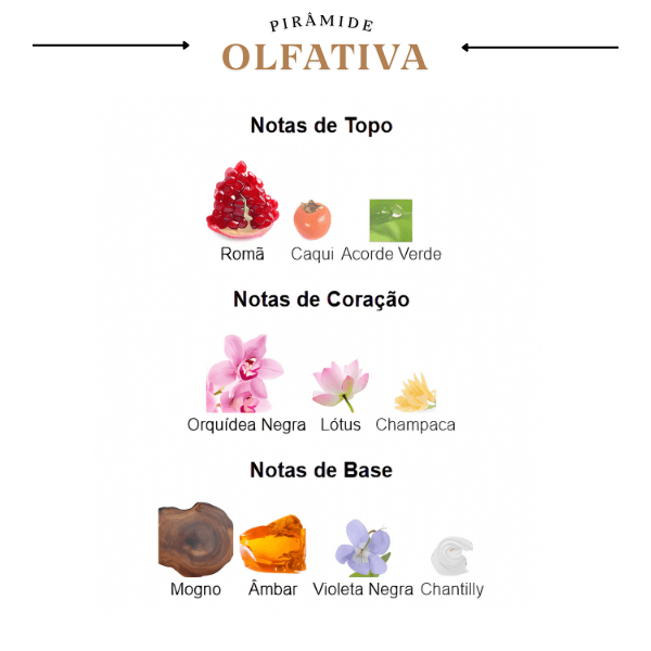 A jornada olfativa se inicia com uma explosão frutada e exótica, onde a romã e o caqui se unem a um acorde verde fresco, criando uma abertura vibrante e convidativa. No coração, a fragrância floresce em um buquê floral rico e cativante, com a assinatura única da orquídea negra, lótus e champaca que adicionam um toque luxuoso e sedutor. A base, quente e envolvente, é um blend de mogno, âmbar e violeta negra, que se fundem em um rastro amadeirado e sensual, complementado pela suavidade do chantilly, garantindo uma impressão duradoura e totalmente inesquecível.