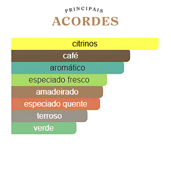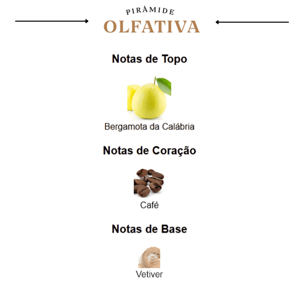 A fragrância se inicia com uma nota de topo vibrante de Bergamota, que confere um frescor cítrico e luminoso, capturando a atenção de imediato. No coração, o perfume revela um acorde intenso e quente de Café, que adiciona um toque viciante e magnético, remetendo a uma xícara de expresso fresco em um ambiente sofisticado. A base é ancorada pelo Vetiver, que confere um toque amadeirado e terroso, proporcionando um rastro elegante e masculino que se destaca com discrição.