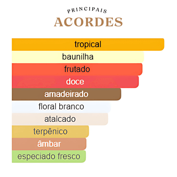 A jornada olfativa começa com uma explosão tropical e ensolarada, onde a suculência da manga se une ao brilho da bergamota, criando uma abertura cheia de energia e frescor. No coração, a fragrância floresce com um toque solar e cremoso, combinando a pureza do jasmim com o misterioso e intrigante olíbano. A base, profunda e sensual, é uma fusão de baunilha e sândalo, que proporciona um rastro amadeirado e quente, garantindo uma assinatura olfativa inesquecível e luxuosa.