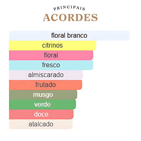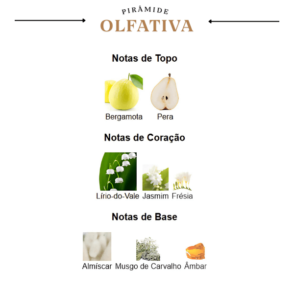 A jornada olfativa se inicia com uma explosão frutada e cítrica de bergamota e pera, criando uma primeira impressão vibrante e refrescante. No coração, a fragrância floresce em um buquê floral branco elegante e cativante de lírio-do-vale, jasmim e frésia, que adicionam uma feminilidade suave e luminosa. A base é limpa e sofisticada, com uma fusão de almíscar e âmbar, que se unem ao musgo de carvalho para garantir um rastro limpo, atalcado e duradouro, deixando uma assinatura olfativa incrivelmente serena e memorável.