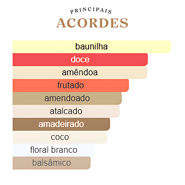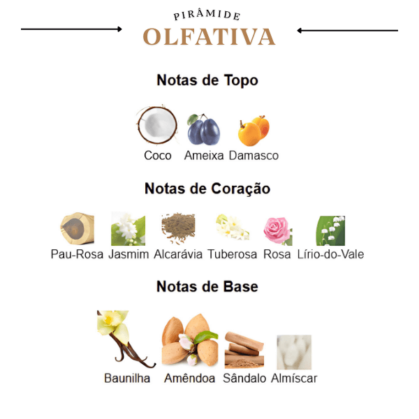 A jornada olfativa se inicia com uma abertura doce e frutada, onde o coco e a ameixa se misturam em um convite exótico e delicioso. No coração, a fragrância floresce em um buquê floral complexo, com notas de jasmim e tuberosa que adicionam um toque de mistério. A base, profunda e inesquecível, é uma fusão de baunilha cremosa e amêndoa, com a suavidade do sândalo e do almíscar que garantem um rastro duradouro e simplesmente viciante, como uma aura proibida e encantadora.