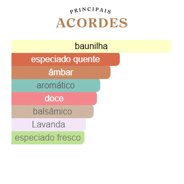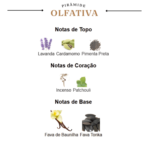 A jornada olfativa se inicia com uma explosão especiada e envolvente de cardamomo e pimenta preta, que se unem à lavanda para criar uma primeira impressão vibrante e sedutora. No coração, a fragrância se aprofunda com um toque quente e amadeirado de incenso e patchouli, que adicionam um mistério e profundidade. A base é rica e voluptuosa, com uma fusão de fava de baunilha e fava tonka, que garantem um rastro doce, sensual e infinitamente viciante, deixando uma assinatura olfativa incrivelmente poderosa e memorável.