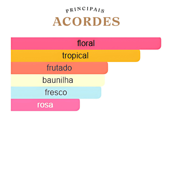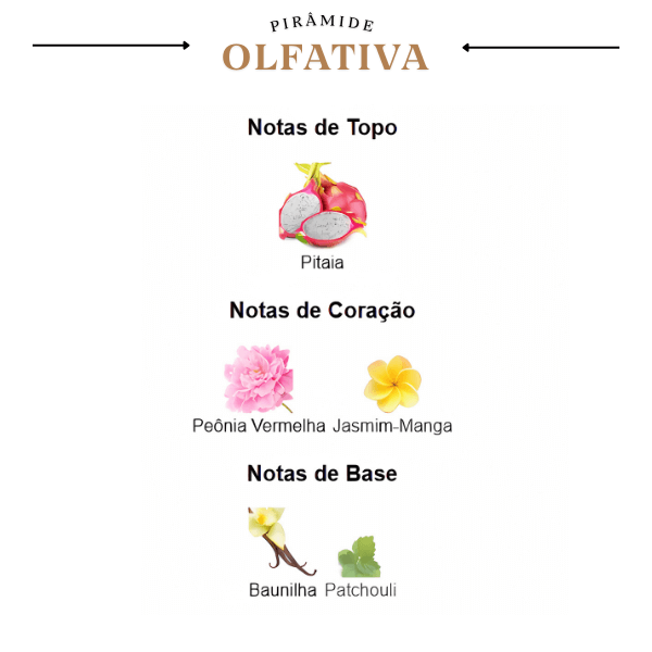 A jornada olfativa se inicia com uma explosão tropical e suculenta de pitaia, uma nota rara e exótica que surpreende e cativa os sentidos. No coração, a fragrância floresce em um buquê floral dominado pela peônia vermelha e pelo jasmim-manga, que adicionam um toque de sofisticação e feminilidade. A base, quente e envolvente, é uma fusão de baunilha e patchouli, que garantem uma assinatura olfativa doce e duradoura, que é ao mesmo tempo exótica, floral e excepcionalmente sensual.