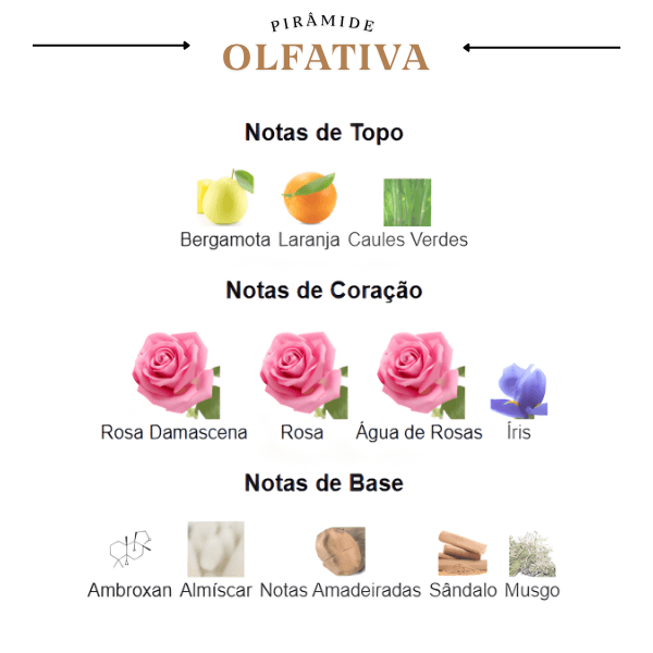A jornada olfativa se inicia com uma explosão luminosa e fresca de bergamota e laranja, acentuada por um toque verde e cintilante dos caules verdes. Este frescor inicial conduz a um coração opulento, dedicado à rainha das flores: a Rosa Damascena em três facetas (a rosa, a água de rosas e a rosa damascena), que se unem à Íris para criar um buquê atalcado e aveludado.