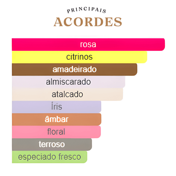 A base é onde o perfume ganha profundidade e longevidade, com o sândalo, notas amadeiradas e musgo, envoltos por um toque suave de Ambroxan e Almíscar. O resultado é um rastro floral, atalcado e confortável, que deixa uma aura de elegância atemporal e viciante por onde você passa.