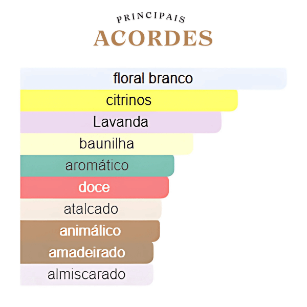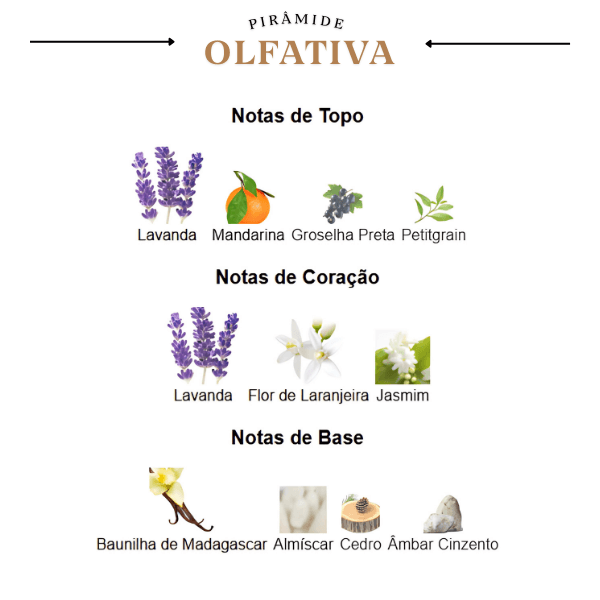 A jornada olfativa se inicia com uma abertura fresca e vibrante, onde a lavanda se encontra com a mandarina e o petitgrain, criando uma primeira impressão luminosa e ousada. No coração, a fragrância se aprofunda com a combinação sensual da flor de laranjeira e do jasmim, que se fundem à lavanda, construindo um buquê floral único e poderoso. A base, quente e envolvente, é uma fusão de baunilha de Madagascar, almíscar e âmbar cinzento, que garantem um rastro duradouro e uma assinatura olfativa incrivelmente sensual e libertadora.