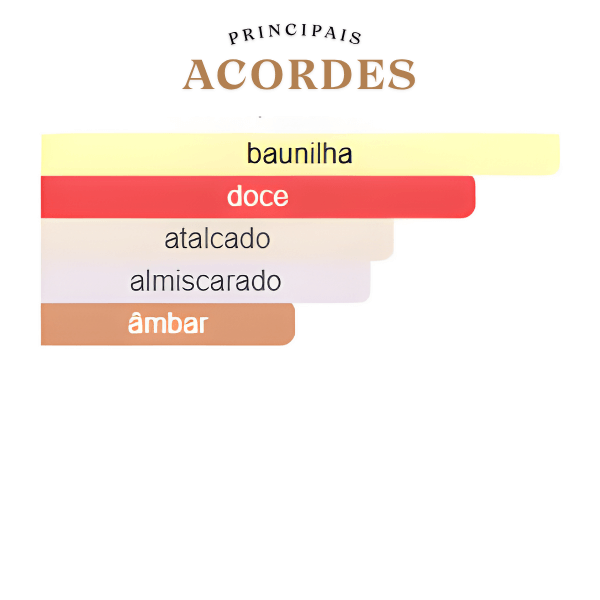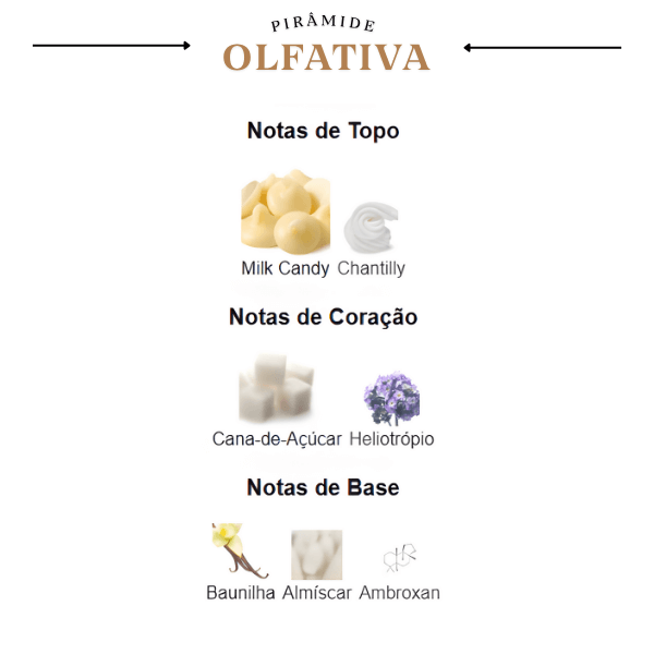 A fragrância se inicia com uma explosão de doçura pura, com notas de Milk Candy e Chantilly, criando uma primeira impressão lactônica e indulgente. No coração, o perfume revela um toque adocicado e atalcado, onde a Cana-de-Açúcar se une ao floral suave do Heliotrópio. O fundo é uma fusão persistente e moderna de Baunilha, Almíscar e Ambroxan, que conferem uma profundidade cremosa, sensual e uma longevidade impressionante.