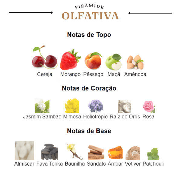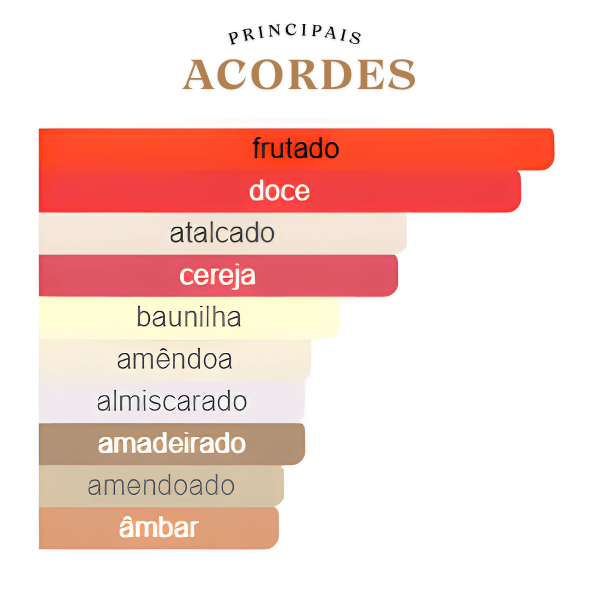 A fragrância se inicia com uma explosão suculenta e deliciosa de Cereja, Morango, Pêssego e Maçã, sutilmente temperada pelo toque aveludado da Amêndoa. No coração, o perfume revela um buquê floral e atalcado com notas de Jasmim Sambac, Mimosa, Heliotrópio, Raíz de Orris e Rosa, que adicionam uma elegância suave e empoada. O fundo é uma fusão poderosa e duradoura de Almíscar, Fava Tonka, Baunilha, Sândalo, Âmbar, Vetiver e Patchouli, que conferem uma profundidade terrosa, quente e uma longevidade impressionante.