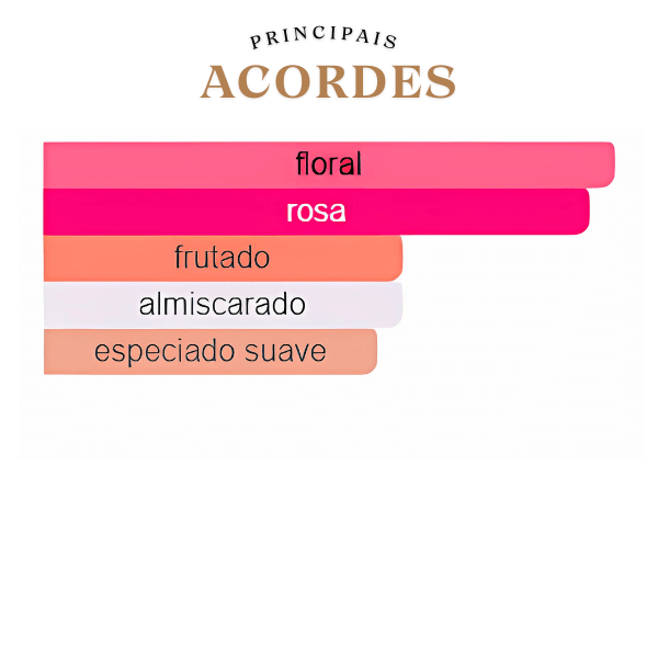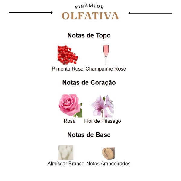 A jornada olfativa se inicia com uma explosão elegante e efervescente de pimenta rosa e champanhe rosé, criando uma primeira impressão vibrante e inesperada. No coração, a fragrância floresce em um buquê floral delicado e sensual de rosa e flor de pêssego, que adicionam uma feminilidade suave e cativante. A base é limpa e sofisticada, com uma fusão de almíscar branco e notas amadeiradas, que garantem um rastro suave e duradouro, deixando uma assinatura olfativa incrivelmente elegante e memorável.