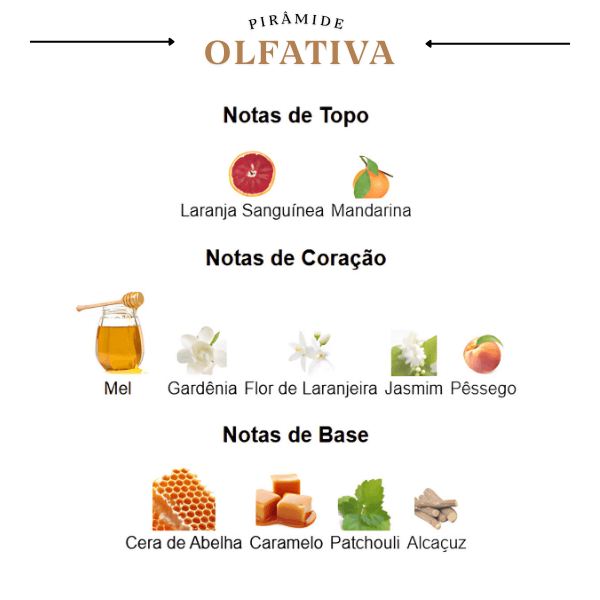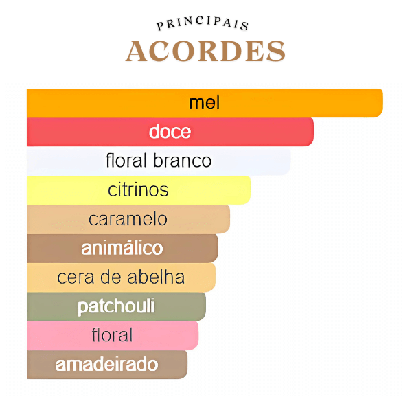 A jornada olfativa começa com uma abertura cítrica e vibrante de laranja sanguínea e mandarina, que traz um frescor luminoso e inesperado. No coração, a fragrância se aprofunda com uma combinação doce e floral de mel, gardênia e flor de laranjeira, que adiciona uma elegância profunda e cativante. A base é rica e inesquecível, com uma fusão de cera de abelha, caramelo, patchouli e alcaçuz, que garantem um rastro doce, sensual e infinitamente viciante, que se torna uma assinatura de pura irreverência.