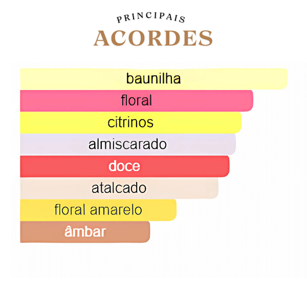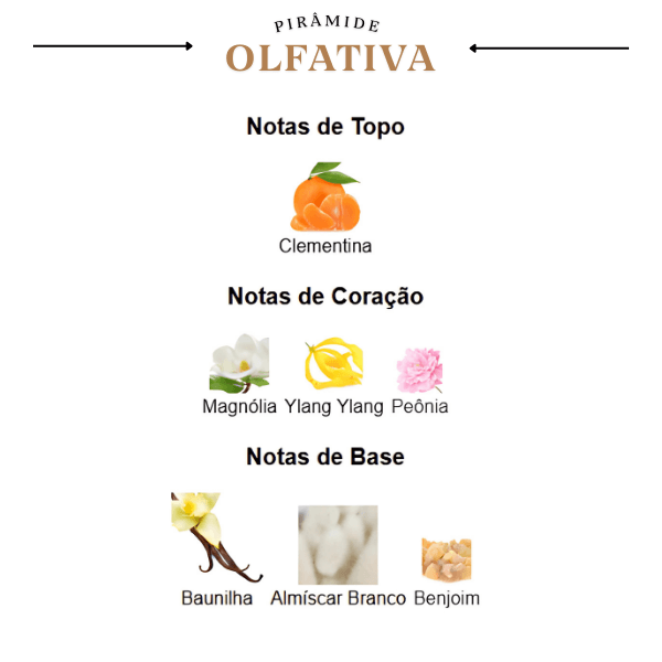 A jornada olfativa se inicia com uma explosão cítrica e luminosa de clementina, criando uma primeira impressão vibrante e revigorante. No coração, a fragrância floresce em um buquê floral branco e elegante de magnólia, ylang-ylang e peônia, que adicionam uma feminilidade suave e cativante. A base é cremosa e envolvente, com uma fusão de baunilha e almíscar branco, que se unem ao benjoim para garantir um rastro doce, atalcado e infinitamente viciante, deixando uma assinatura olfativa incrivelmente serena e memorável.