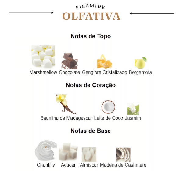 A jornada olfativa se inicia com uma explosão açucarada e inusitada de marshmallow e chocolate, que se misturam a um toque especiado e cítrico de gengibre cristalizado e bergamota. No coração, a fragrância se aprofunda com uma combinação cremosa e exótica de baunilha de Madagascar e leite de coco, que se unem ao jasmim para criar uma sensação de conforto. A base é macia e envolvente, uma fusão de chantilly, açúcar e almíscar, que garantem um rastro doce, aveludado e irresistível, deixando uma assinatura olfativa incrivelmente deliciosa e memorável.