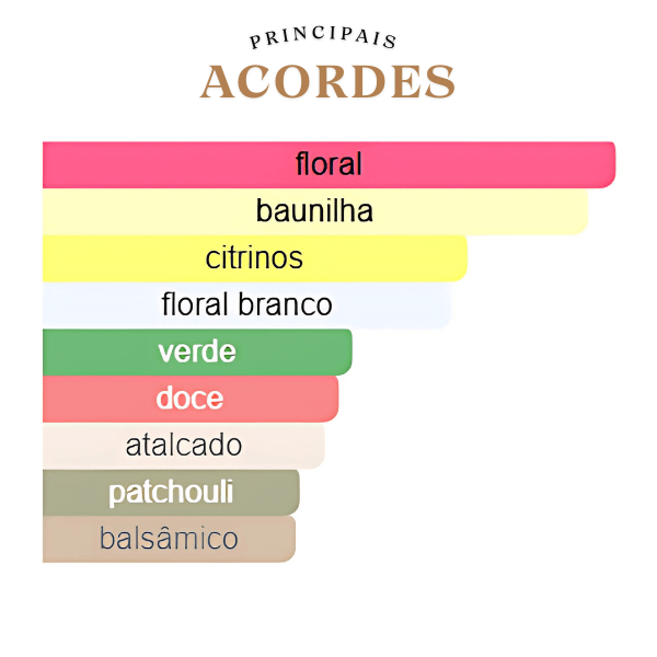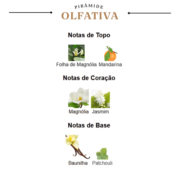 A jornada olfativa se inicia com uma abertura luminosa e fresca de mandarina, que se une à folha de magnólia, criando uma primeira impressão vibrante e inesperada. No coração, a fragrância floresce com um buquê floral branco elegante e envolvente de magnólia e jasmim, que adicionam uma camada de feminilidade e pureza. A base é rica e inesquecível, com uma fusão de baunilha e patchouli, que garantem um rastro doce, cremoso e sensual, deixando uma assinatura olfativa incrivelmente poderosa e memorável.