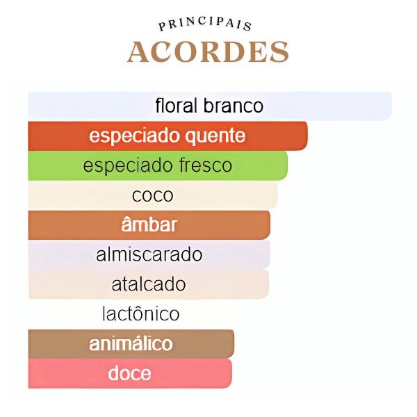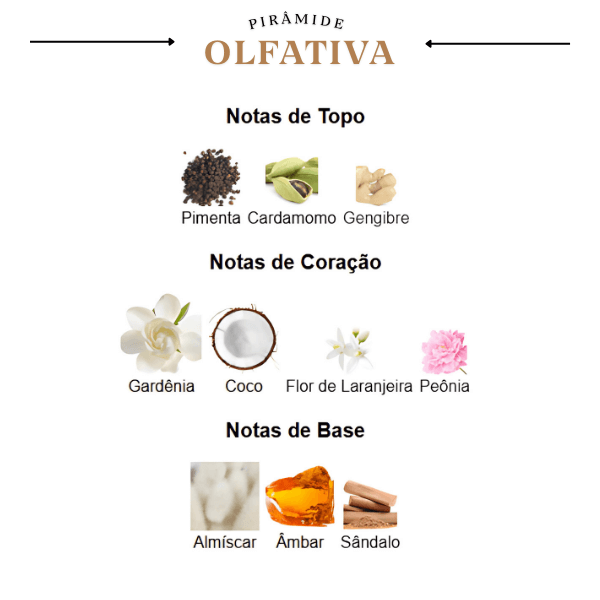 A fragrância se inicia com um toque quente e especiado de Pimenta, Cardamomo e Gengibre, criando uma abertura vibrante e intrigante. No coração, o perfume se revela em um buquê floral elegante, com notas de Gardênia, Coco, Flor de Laranjeira e Peônia, que adicionam uma camada de doçura tropical e uma aura sofisticada. A base é uma fusão persistente de Almíscar, Âmbar e Sândalo, que conferem uma profundidade amadeirada, quente e uma longevidade impressionante.