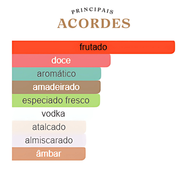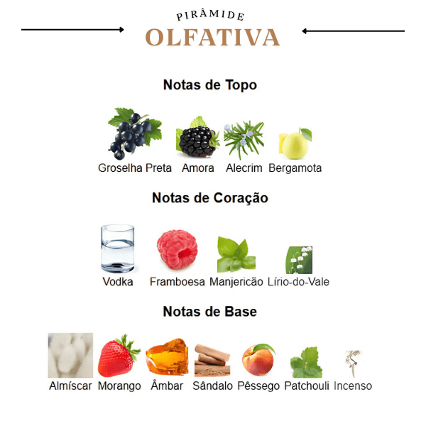 A fragrância se inicia com uma abertura vibrante e ácida, dominada pela Groselha Preta e Amora, suavizadas pelo frescor cítrico da Bergamota e o toque herbal do Alecrim. No coração, o perfume revela sua essência mais intrigante com a nota efervescente de Vodka, que se funde à doçura da Framboesa e ao frescor verde do Manjericão e do Lírio-do-Vale, criando um coquetel olfativo sofisticado. A base é quente e complexa, com a cremosidade do Pêssego e Morango, a resina do Âmbar e o Incenso, o terroso do Patchouli e a maciez do Almíscar e Sândalo, garantindo um rastro sensual e envolvente.
