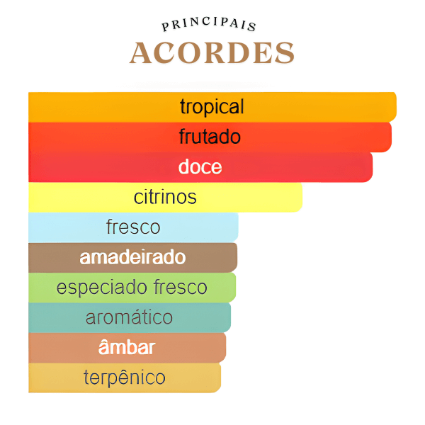 A fragrância se inicia com uma explosão tropical, ácida e picante, dominada pela suculência da Manga, o frescor do Limão, a acidez verde do Ruibarbo e o calor do Gengibre. No coração, o perfume revela um toque adocicado e floral, onde o Pralinê gourmand se une à delicadeza do Jasmim e Violeta, temperado pela Pimenta Rosa. A base é uma fusão poderosa e persistente de Fava Tonka, Cedro, Âmbar Cinzento e Musgo, que conferem uma profundidade amadeirada, quente e uma longevidade impressionante.