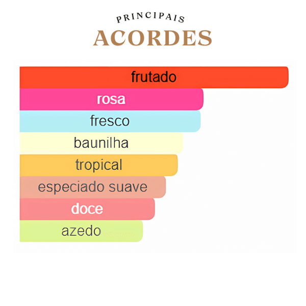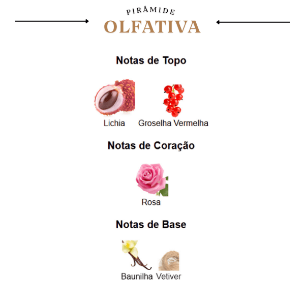 A sua jornada olfativa se inicia com a explosão suculenta e frutada da lichia e da groselha vermelha. No coração, a fragrância ganha elegância e romance com a única e poderosa nota de rosa. Para finalizar, as notas de base de baunilha e vetiver adicionam uma profundidade cremosa e sofisticada, tornando o aroma irresistível.